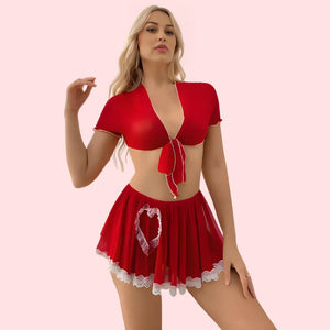 Turn up the romance with our Sweet Temptation Red Heart Mesh Roleplay Costume. Designed to ignite playful passion, this flirty two-piece set features a front-tie crop top with delicate edging and a sheer mesh mini skirt adorned with a charming lace heart cutout. The vibrant red hue, soft fabric, and feminine silhouette make it perfect for special nights and fun roleplay moments. Lightweight, comfortable, and irresistibly sexy — this set is made to captivate.